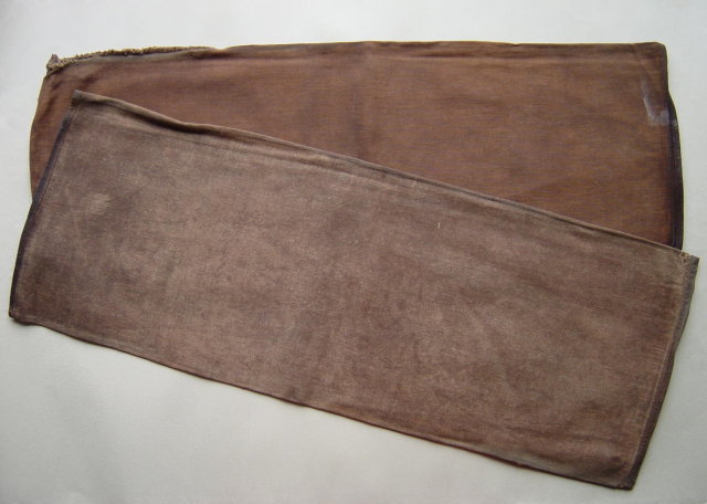 木綿の袋に、丹念に柿渋を染みこませ、何年もの間酒絞りに使用した風合いのある逸品です。 この袋を使って作ったこれは、私の自慢の品です。 この度、蔵の天井を修理する際、天井裏より大量に発見いたしました。 もしもご入用の方がいらっしゃいましたら、メールでお問い合わせください。 |